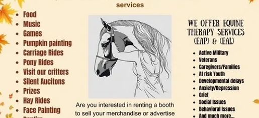 Come join us for a fun day out! We will have fun activities for free and activities that have a small fee that we use as our yearly fundraiser to support our Equine Therapy Programs. It is a great family day out to enjoy the weather, all the animals and fun fall activities.